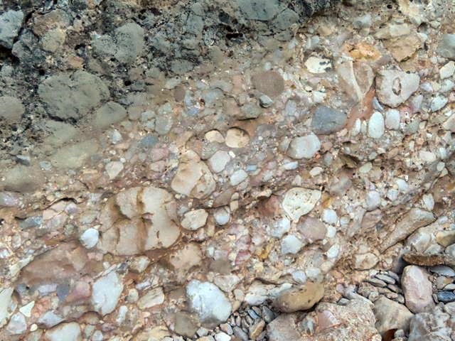 La marca del agua en las crecidas ha dejado su impronta en la roca con un tono más blanquecino, y si nos fijamos bien, se puede apreciar su composición, un conglomerado de piedras de todos los tamaños cimentado durante millones de años.