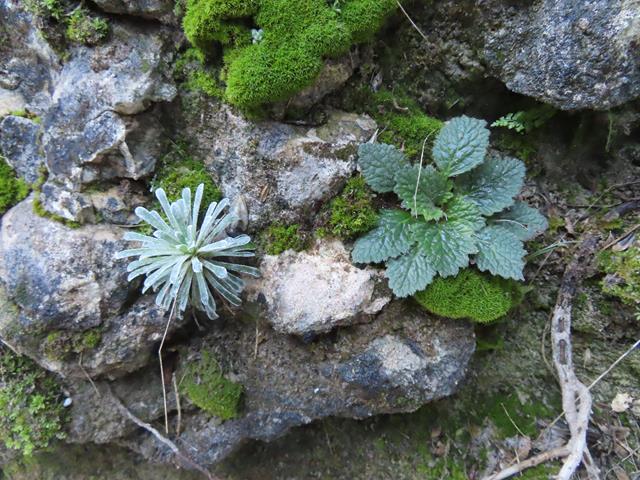 Las paredes albergan vegetación variada, entre otros, la Corona del Rey, con su característica forma y la Oreja de Oso, ahora con las flores cerradas. En la foto de debajo, de izquierda a derecha.
