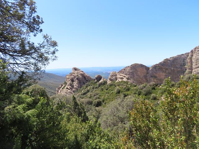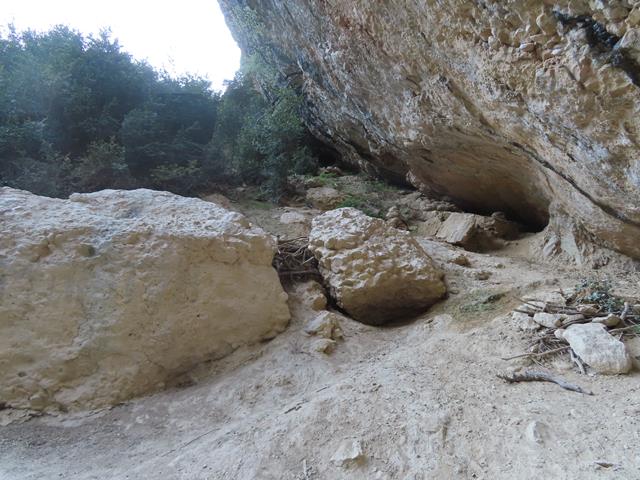 Llega un momento en que la piedra desaparece y pisamos tierra. Ya se atisba el fondo del barranco. En la pared de conglomerado se pueden ver las marcas del GR de nuevo.