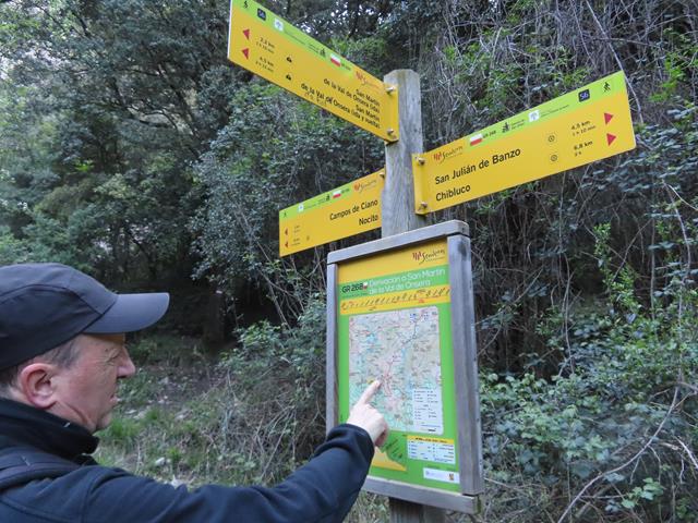 El pueblo está dividido en dos barrios, el alto y el bajo. Justo entre ambos y tras una pronunciada curva, parte una pista a mano derecha hacia Chibluco y San Julián de Banzo tal y como nos indica un cartel de dirección.