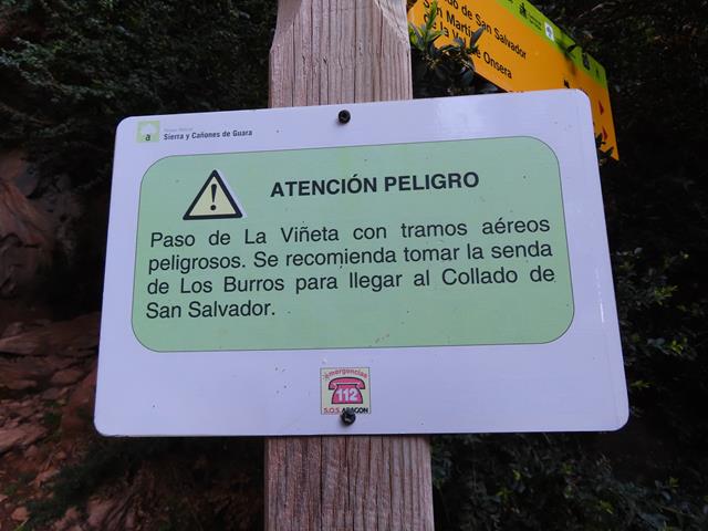 Llegamos al lugar donde está colocado el poste. Junto a una gran piedra en el suelo parte una estrecha senda que sube por el bosque. Es el inicio del Paso de la Viñeta. En los carteles que figuraban al inicio de la ruta, se referían al Paso de la Viñeta como sigue: «…el sendero S6 continúa por la Senda de los Burros.El Paso de la Viñeta no forma parte de acceso a la Ermita de San Martín de la Val D’Onsera ofertado por el Parque Natural de la Sierra y Cañones de Guara y no se recomienda por tener pasos con peligro de caídas. El Paso de la Viñeta se considera una vía ferrata. La escalada en vías ferratas es una actividad no exenta de riesgos pudiendo llegar a ocasionar accidentes graves e incluso mortales«.