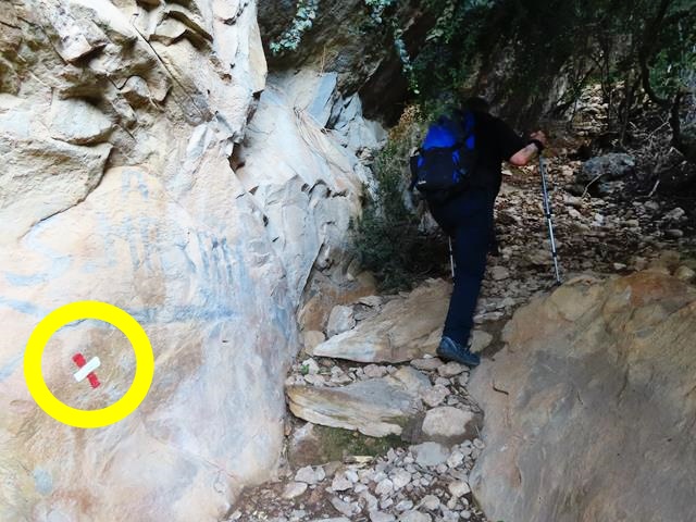 Nada más comenzar ya queda claro por una marca en forma de aspa con los colores rojo y blanco pintada en la roca que nos hemos salido del GR 268.