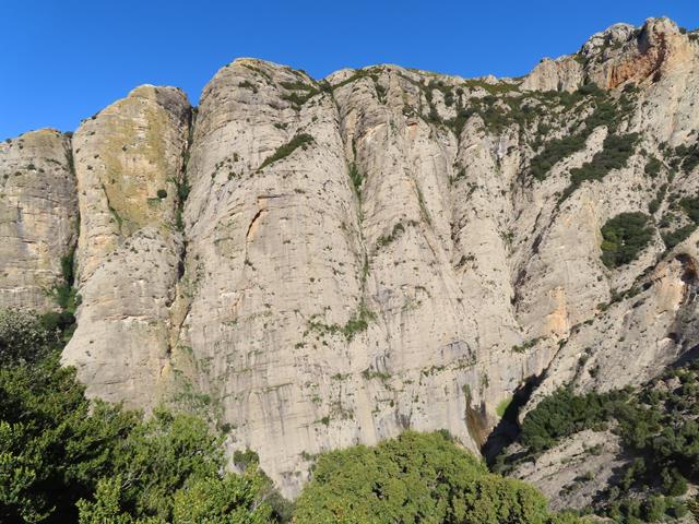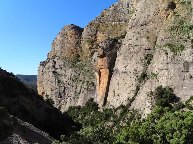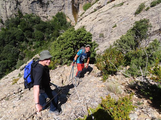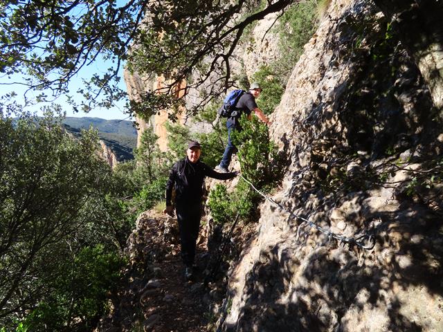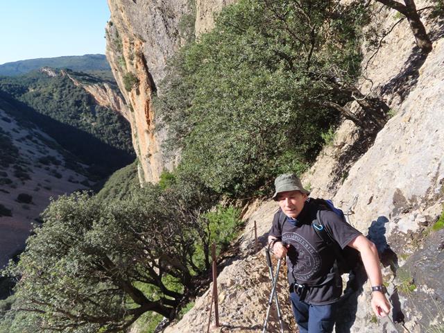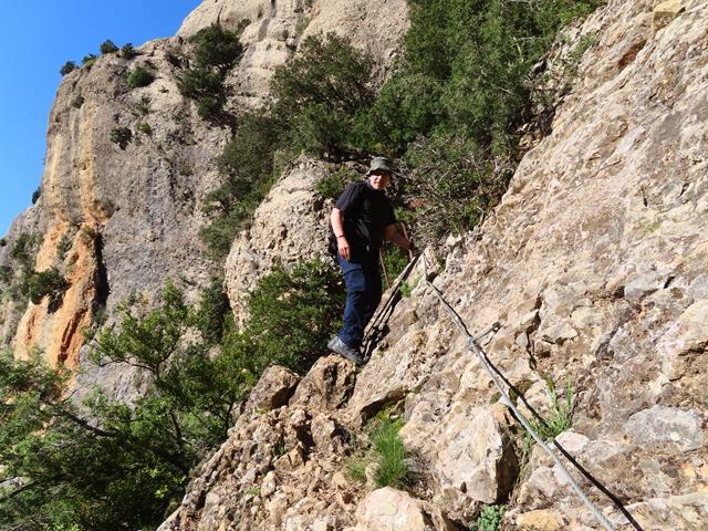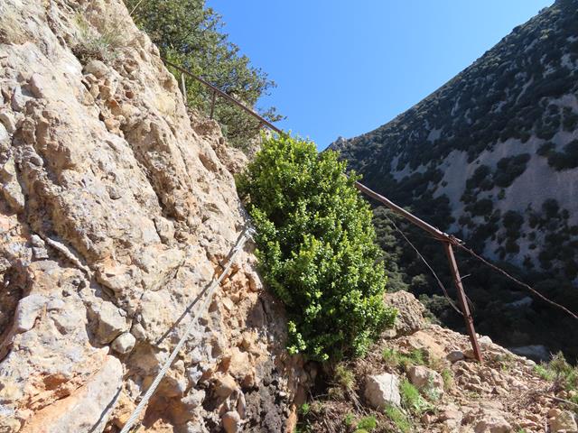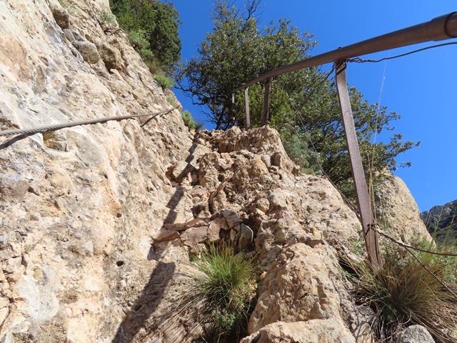 La senda va en todo momento por la pared de roca, alternando las zonas más despejadas con otras con abundantes arbustos. Siempre tenemos a mano las sirgas metálicas, lo que nos sigue proporcionando una sensación de cierta seguridad, aunque eso sí, sin bajar la guardia.