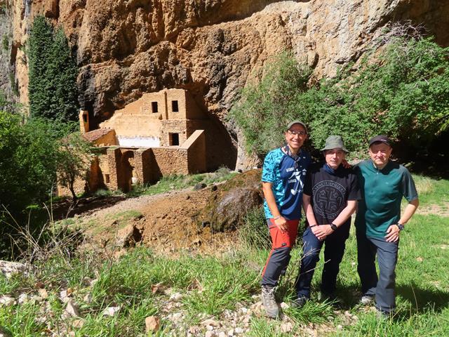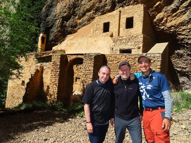 Nos hacemos unas fotos de recuerdo y nos disponemos a disfrutar un rato del precioso rincón al que hemos llegado. La verdad es que no nos deja de sorprender, ni mucho menos nos deja indiferentes. Sobre todo por la existencia de una cascada de unos treinta metros que cae desde lo alto de una de las esbeltas paredes de roca bajo las que se cobija la ermita, creando un ambiente realmente especial y muy relajante. Lástima que no lleve mucho caudal, porque si de por sí ya es bonita, bien crecida, debe ser algo digno de ver.