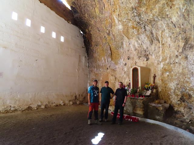 Al frente, otro acceso. Entramos. Una gran sala nos recibe. En realidad han aprovechado la roca para construir unos muros que la cierran y han creado ese espacio enorme. El techo, sigue siendo la propia roca, unos cuantos metros por encima de nosotros. Hay un pequeño altar dedicado a San Martín y al fondo una fuente.Nos hacemos unas fotos.
