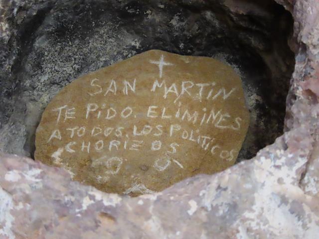 En la pared de roca, y a la izquierda del altar, en una pequeña oquedad, han colocado una piedra con algo escrito. Está en lo alto, no se puede llegar allí salvo con una escalera, pero yo con el zoom de la cámara puedo intentar fotografiar lo que pone. Dicho y hecho, dice así: «San Martín, te pido elimines a todos los políticos chorizos». Habría que ver si San Martín le hace caso, jajaja.