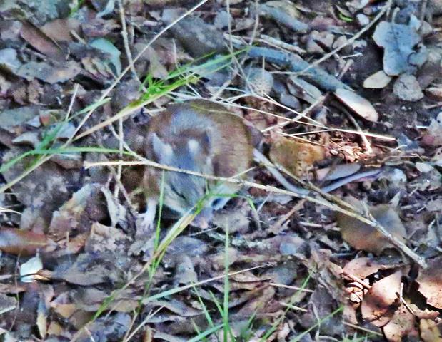 Pero también en el suelo se ven otras «cosas». Un ratoncillo, inmóvil, intenta camuflarse de mí presencia entre la hojarasca, pero yo con la cámara logro fotografiarlo antes de que se esfume.