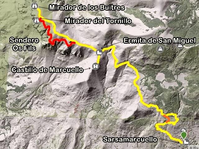 La idea es, desde la localidad de Sarsamarcuello, primero alcanzar caminando por la pista la ermita de San Miguel, y después llegar al mirador de los buitres por la aérea senda de Os Fils, un serpenteante camino al borde de los acantilados del mismo nombre. El mirador de los buitres es accesible también en coche para el que no quiera andar, ya que puede realizar este recorrido íntegramente por la pista, que por otro lado está en bastante buen estado y es apta para turismos.