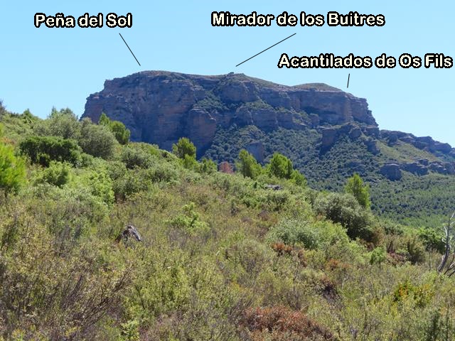 Así que poco a poco voy subiendo por la pista hasta que llego a las proximidades del mirador de los buitres y a la cima de la cresta de los acantilados de Os Fils, la Peña del Sol o Peña de Don Justo (1.260 m) donde se encuentra el mirador y que está conectado con la senda de Os Fils.