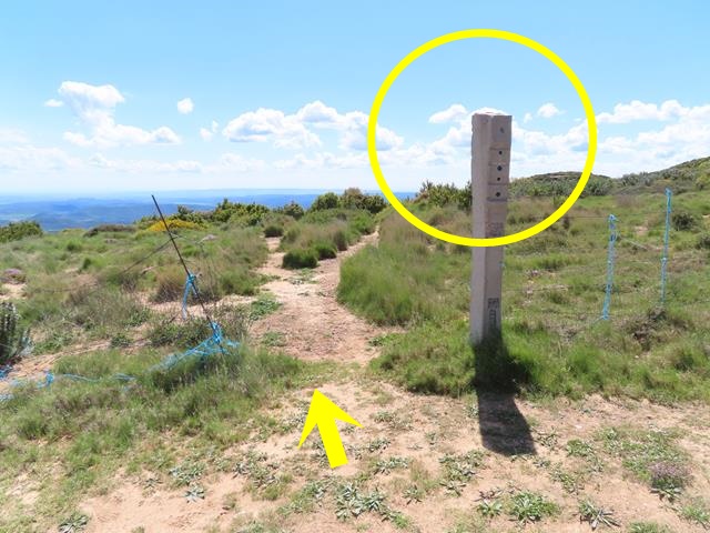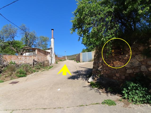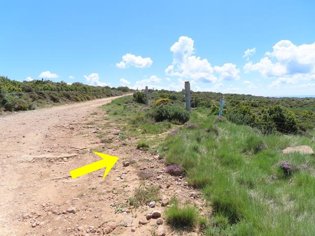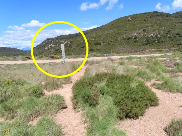 Sigo caminando por la pista y justo a la altura de una losa de hormigón,veo que parte un sendero a la izquierda. Desconozco hacia donde se dirige, pero lo voy a inspeccionar, ya que a lo lejos observo un poste indicativo. Me acerco a ver. No voy en coche, así que no tengo por qué ir en todo momento por la pista si puedo acortarla en algún tramo.
