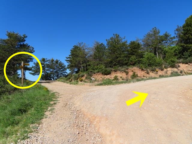 A los diez minutos aproximadamente llego a un punto en el que la pista se bifurca. Debo continuar ascendiendo hacia la derecha tomando la curva.Un cartel situado a mi izquierda me indica la dirección correcta justo en la intersección. En este punto hay algún bache en la pista si vas en coche de suelo bajo, precaución.