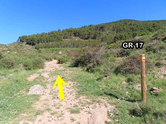 Otro pequeño poste indicativo aparece a mi derecha en el que figura la inscripción GR 17, así que veo que el sendero por el que he ido antes y que desembocaba en la pista no ha desaparecido, sino que continúa por aquí «con algo más de amplitud».