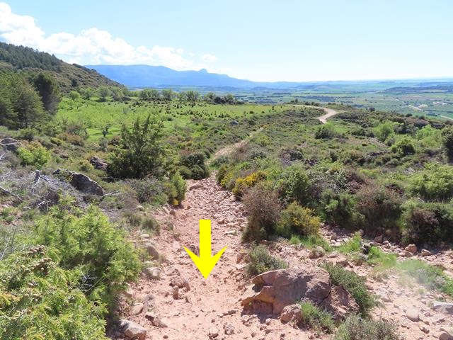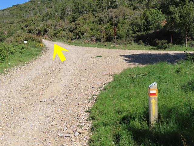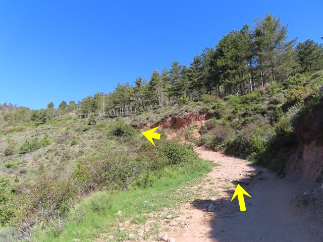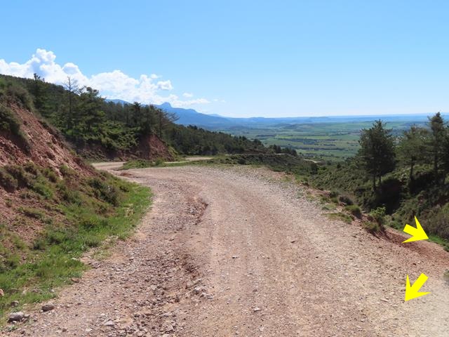 No iba mal encaminado. Al final, salgo a la pista (en la foto de debajo, os pongo con flechas amarillas la salida desde el sendero).Seguro que me he ahorrado unos cuantos cientos de metros y el paso de algún coche, aunque la verdad, hoy por aquí, de momento, no he visto a nadie. Se nota que es un lunes laborable.