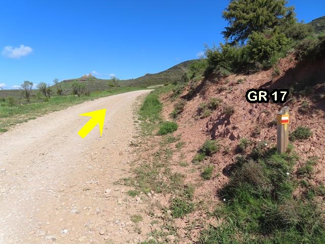 Una vez ya junto al poste indicativo, veo que corresponde al GR 17. Decido seguirlo con el convencimiento de que quizás me lleve otra vez a la pista, y si no fuera así, ya encontraría otro atajo para retomarla, o en el peor de los casos siempre puedo regresar por donde he venido.