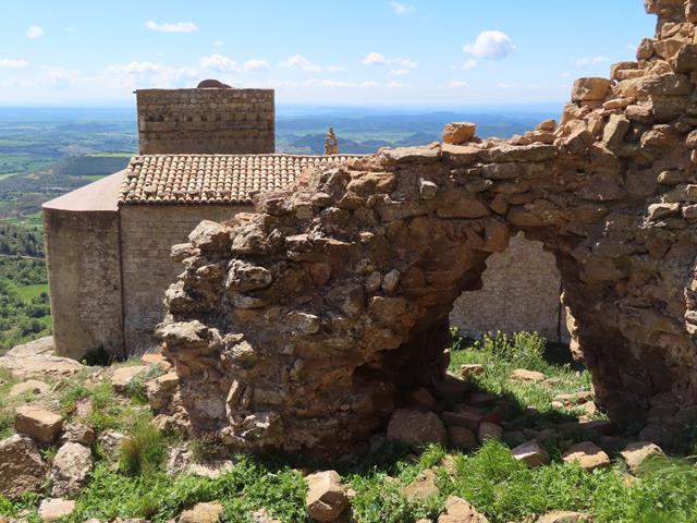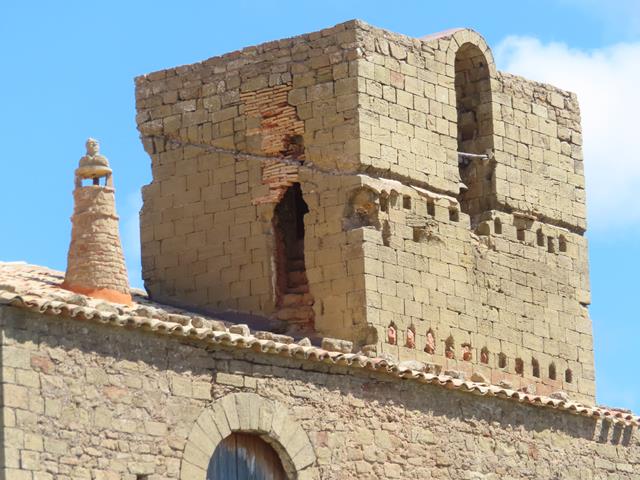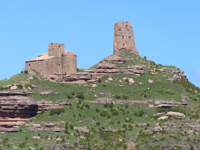 Después veo la iglesia del castillo que aparentemente presenta mejor estado de conservación, tiene aspecto de fortificación, se observa una torre cilíndrica con aspillera a la que hay adherida otros edificios.Parece que el conjunto se asienta sobre la roca. Esto es lo que observo mientras asciendo por la pista, ya veremos después al llegar al lugar.