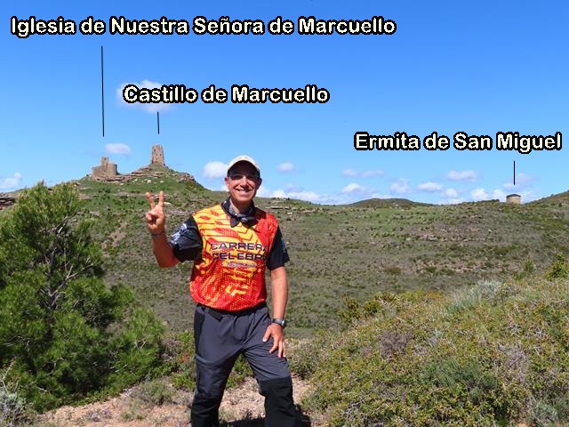 Continúo por la pista y un saliente del terreno me permite contemplar a lo lejos el castillo y la iglesia de Marcuello a mi izquierda y la ermita de San Miguel a mi derecha. Las tres entran en el encuadre, así que me parece un buen lugar para hacerme una foto de recuerdo.