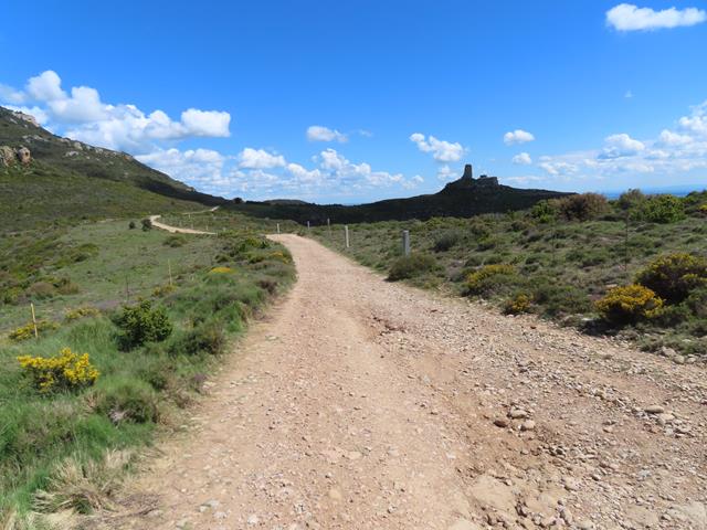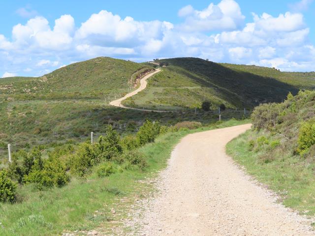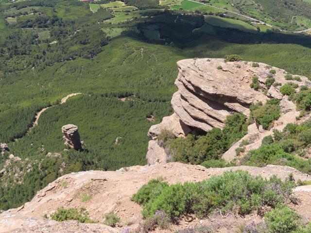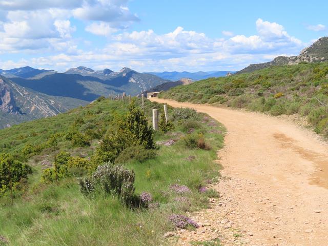 Una vez he visto las ruinas del castillo y la iglesia, vuelvo de nuevo a la pista con dirección al mirador de los buitres. Son las 12:45 horas. He dedicado tres cuartos de hora en ver el castillo y la iglesia así como el mirador, y en volver hasta la ermita. La idea es llegar al mirador de los buitres por el sendero de Os Fils, y disfrutar de sus vistas y de las curiosas formaciones rocosas. Ahora debo seguir hacia el collado de Santo Román y localizar la entrada al sendero.