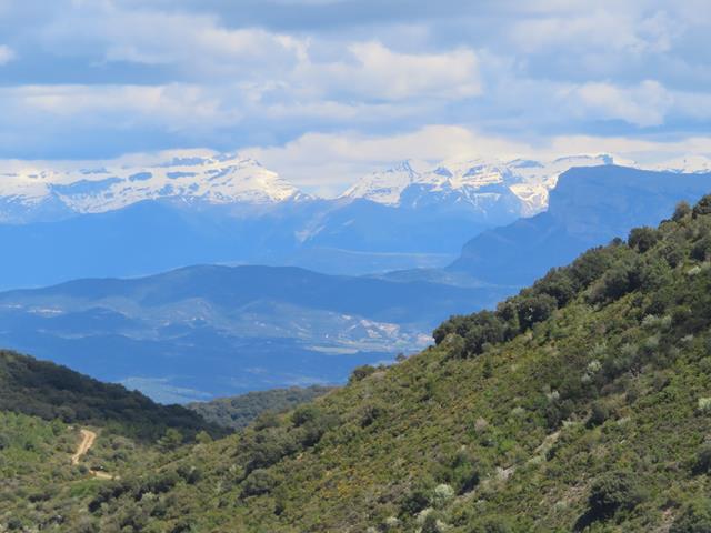 Voy subiendo la pista y a mi derecha aparecen las siluetas de las nevadas cumbres de los Pirineos. Distingo la Peña Oroel, a mi derecha, y algo más al fondo algunos picos parcialmente cubierto por las nubes y que no logro identificar.