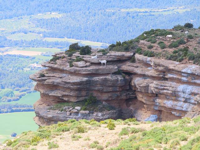 Ya estoy muy cerca del mirador y ahí están, tumbadas. Les hago una foto con zoom con el pueblo de Sarsamarcuello al fondo. Yo en ese momento no lo sabía, pero resulta que estas cabras no son unas cabras cualquiera.