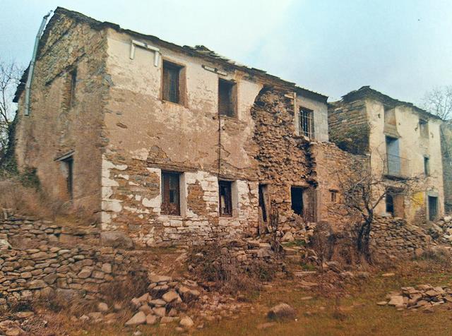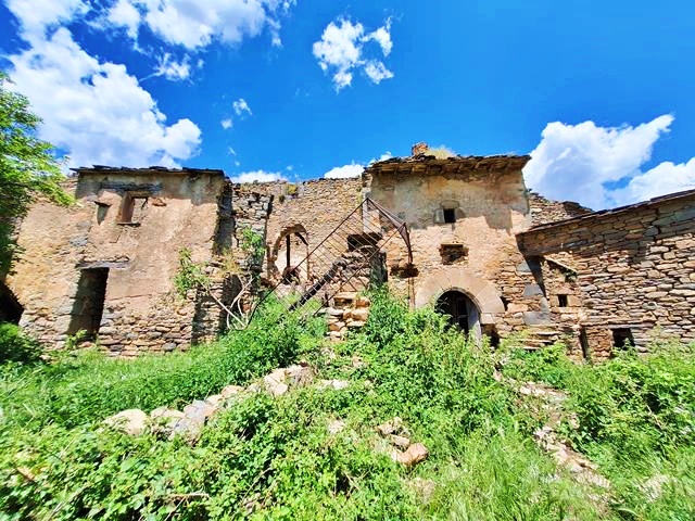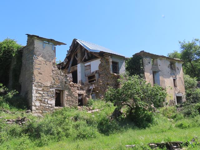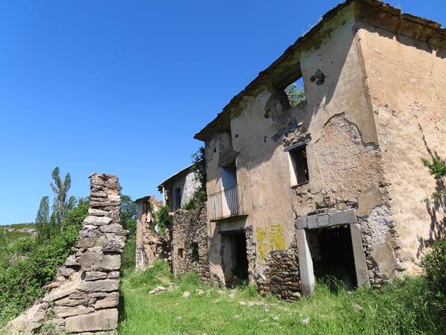 Nada más llegar, y junto a una gran planicie herbosa, se levantan las primeras casas de este despoblado de Otín. Estamos en 2025, y la verdad es que el deterioro experimentado por las construcciones respecto a décadas anteriores viene siendo notable. No hay más que ver algunas fotos, como la que os pongo bajo estas líneas para darse cuenta. A este ritmo de descomposición, tal vez en años no quede casi nada que ver de estas ruinas.