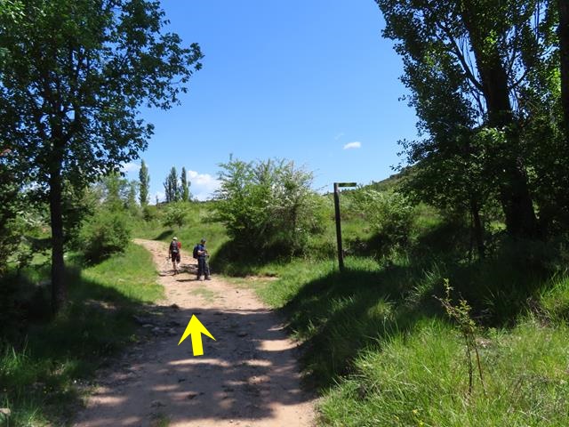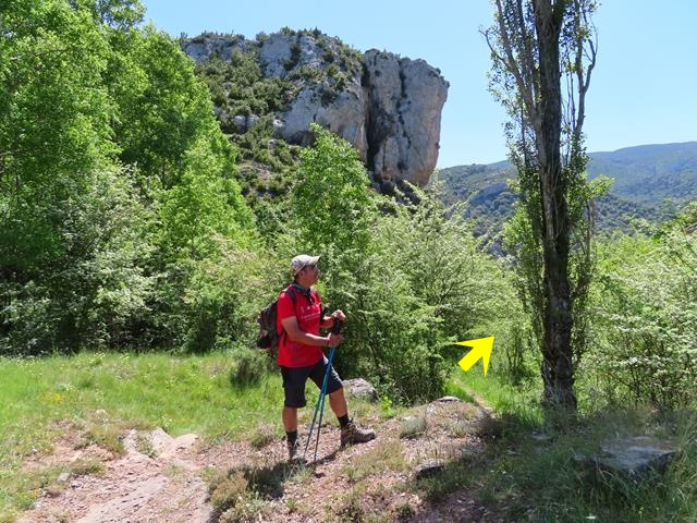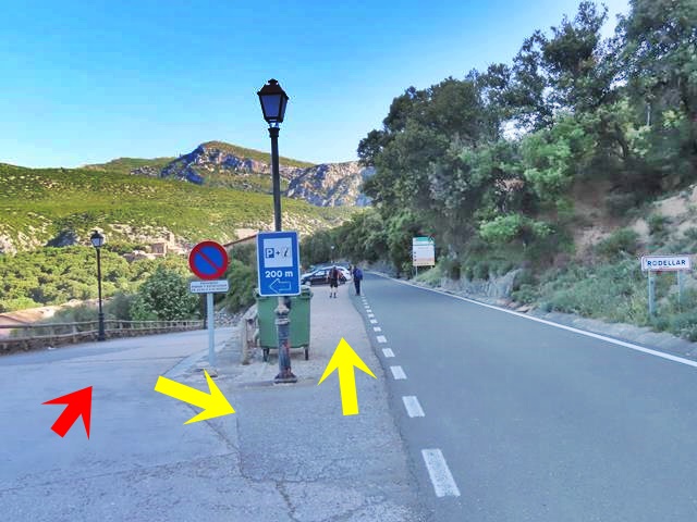 En la foto de debajo os pongo con la flecha roja, la dirección que debemos tomar con el coche para llegar al aparcamiento (bajando la cuesta) y con las flechas amarillas, el camino de vuelta andando, una vez que hemos aparcado, y la dirección que debemos seguir para llegar a Rodellar.