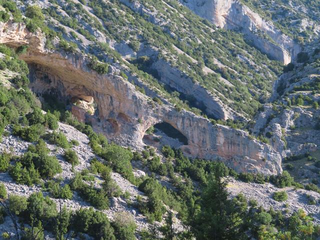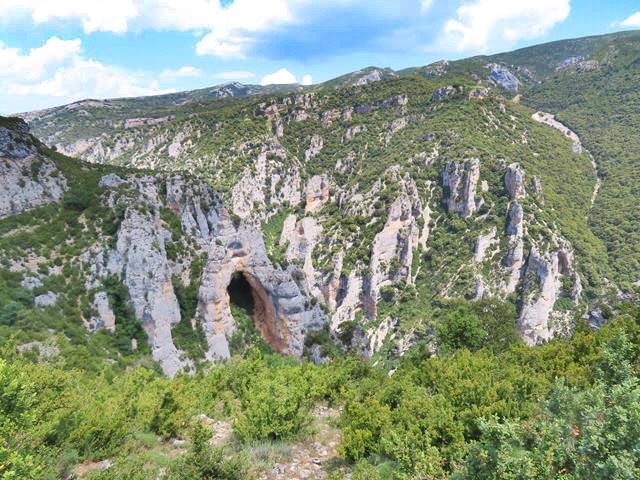 A nuestra izquierda, el paisaje ya nos deja ver las primeras rocas calcáreas que forman caprichosos y espectaculares arcos. Son el resultado de la combinación de procesos erosivos fluviales, kársticos y eólicos que han actuado a lo largo de millones de años sobre las rocas sedimentarias que aquí se encuentran (principalmente conglomerados y calizas marinas plegadas), desgastando las capas más blandas y dejando expuestas las más resistentes.