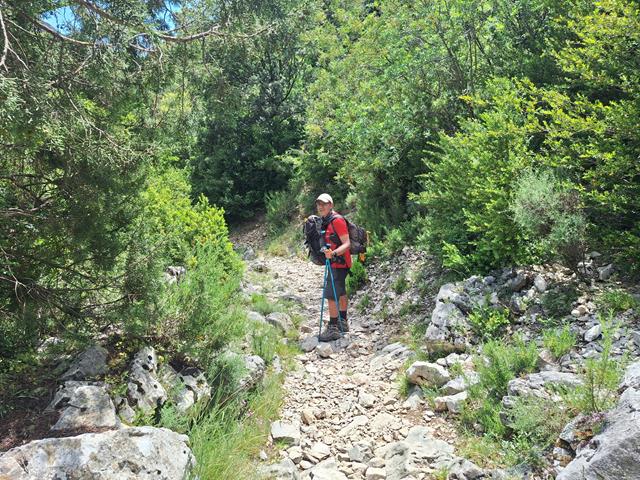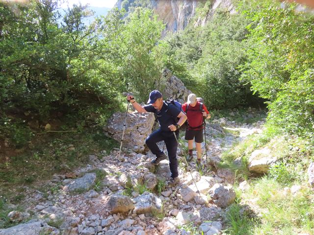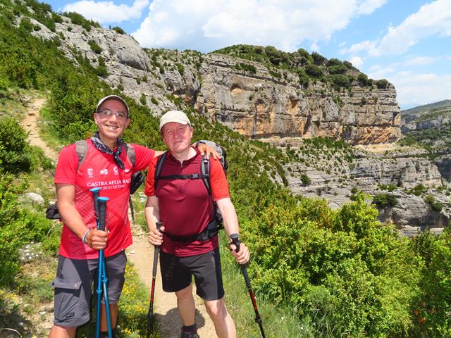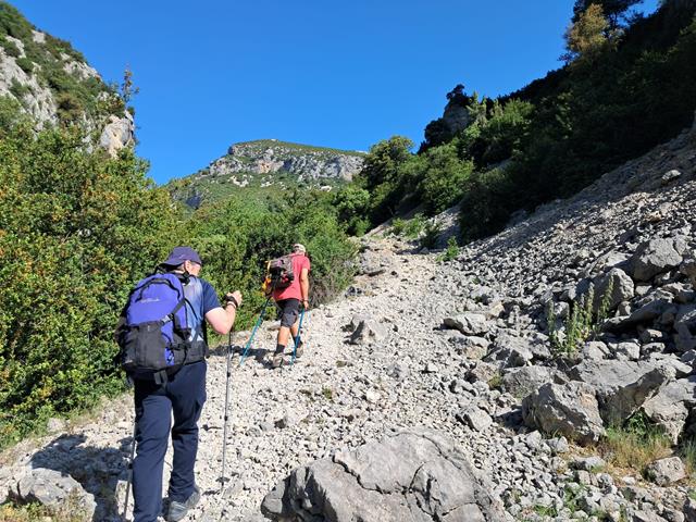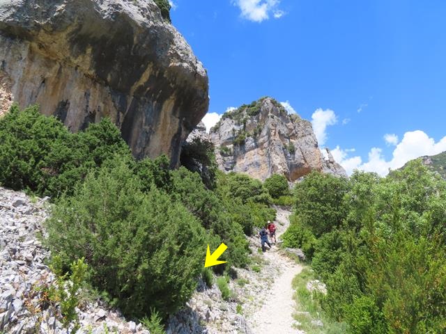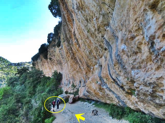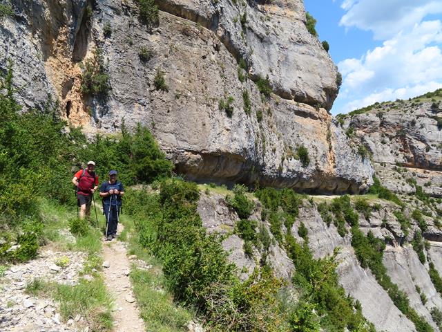Ya en el desfiladero nos rodean grandes murallones de roca por la derecha. Venimos acalorados por la subida del barranco de Andrebot y de recorrer el sendero bajo el sol, pero cuando llegamos a este punto, y protegidos por la sombra de los murallones, un viento fresco y agradable nos reconforta. Casi hace fresco. El metal de los bastones, cuando lo tocas, está frío.