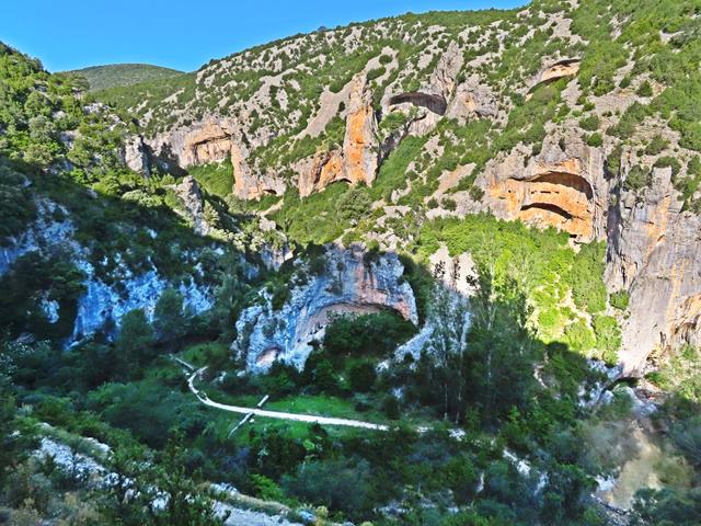 Ahora tenemos unos 4 km aproximadamente de bajada hasta Rodellar y unos 360 m de desnivel negativo. El descenso de la Costera a estas horas y con el calor se nos hace algo penoso. Es un sendero con una acusada pendiente y además tiene abundante piedra suelta. Pero no por eso está libre de atractivos. Las vistas desde aquí del barranco del Mascún siguen siendo impresionantes.