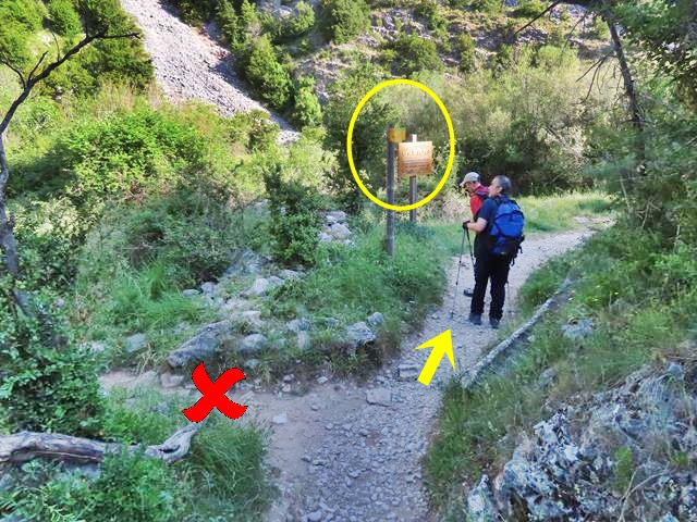 Son las 9:45 horas cuando llegamos a la zona llamada de la Pardina Seral. Unos postes de dirección nos indican que estamos a 1,7 km y 40 minutos del dolmen de la Losa Mora y a 3,7 km y 1, 15 horas de Otín desde aquí. Hay que seguir por donde os indico con las flechas amarillas en la foto.