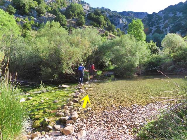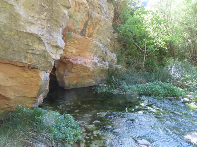 Ya hemos llegado hasta el barranco y el río Mascún que tenemos que cruzar, y no será la primera vez. El cauce no lleva mucho caudal, así que se puede cruzar aprovechando unas piedras que han colocado para atravesarlo. Después tendremos que ir remontando unos metros el barranco hasta llegar a la surgencia del Mascún. Estamos recorriendo el Mascún Inferior.