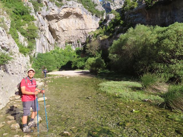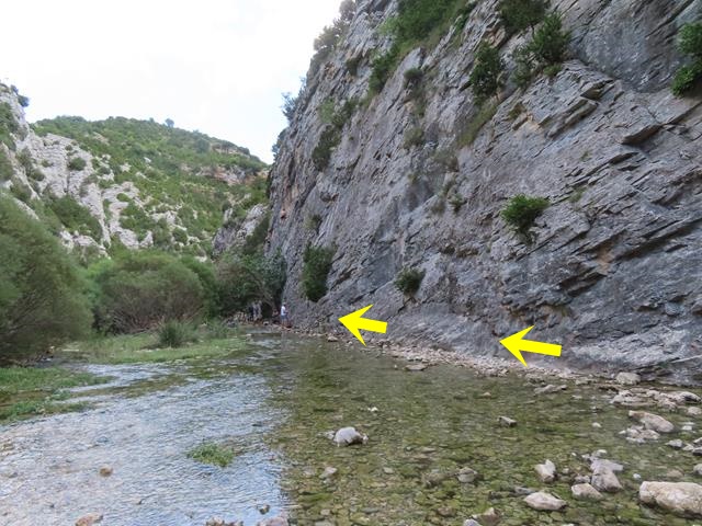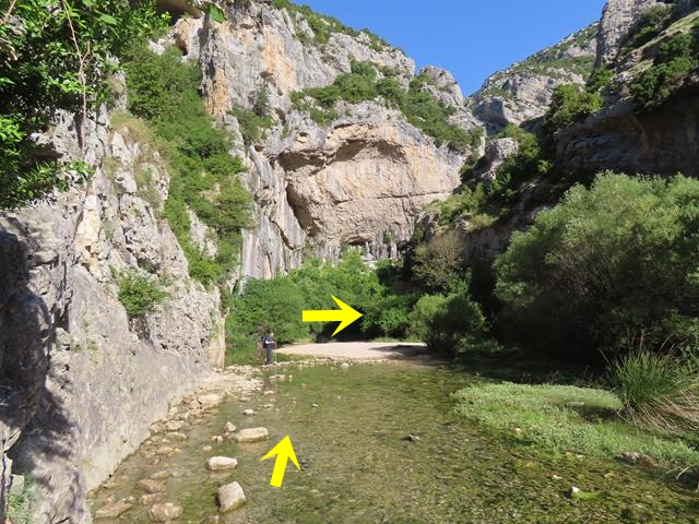Superado ya el tramo de la surgencia, seguimos avanzando ahora por tramo seco. A nuestra espalda, podemos ver la curiosa formación rocosa llamada » la ventana» o «el delfín» porque por el contorno que presenta recuerda a este mamífero marino. Si os fijáis bien en el hueco del arco que aparece en la foto, realmente sí parece un delfín. Estas rocas son muy populares entre los escaladores ya que en ellas se encuentran algunas de las vías de mayor dificultad de la zona como la ferrata del Espolón de la Virgen.