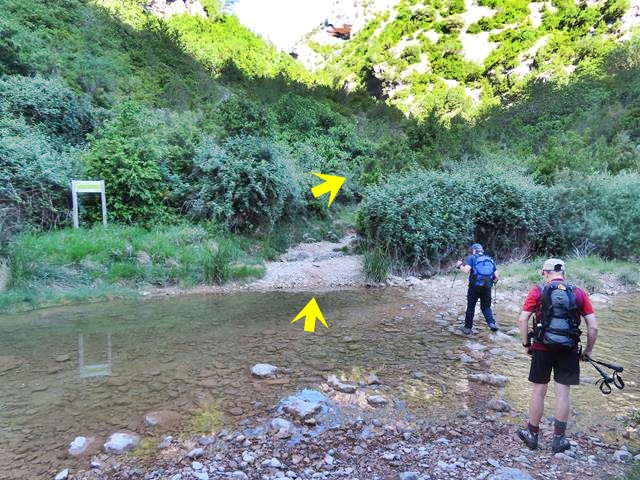 Y otra vez el sendero nos saca al cauce del Mascún que tenemos que volver a cruzar. Menos mal que este río no lleva mucha agua porque si no, nos hubiéramos tenido que mojar los pies sí o sí. De todas formas, los tres veníamos preparados con unas chanclas de montaña que llevábamos en la mochila por si hubiera sido preciso utilizarlas.