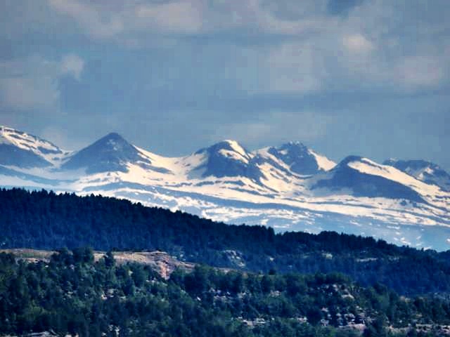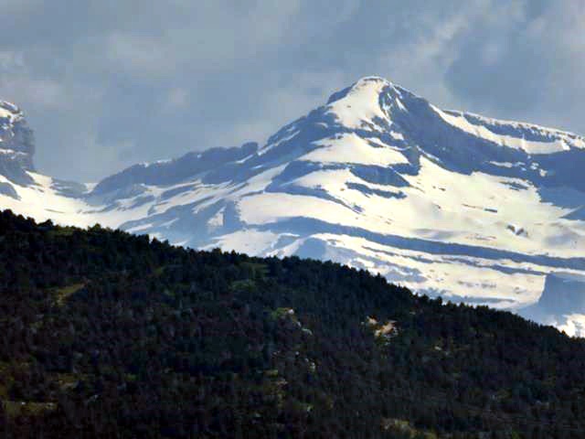 Y sí es cierto que el sendero nos lleva hacia el norte, porque en el horizonte, puede verse el Pirineo axial, el macizo de Monte Perdido, el pico Añisclo y las Tres Marías, aún con mucha nieve. Un espectáculo que con el zoom de la cámara no se me puede escapar.
