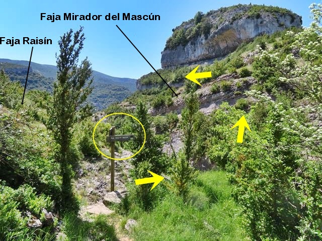 Nosotros ahora nos disponemos a cruzar el barranco Raisín para subir por la ladera que nos permitirá acceder a la faja del Mirador del Mascún, también muy aérea pero sin pasos arriesgados. No obstante sobra decir que cuando vayáis por cualquier tipo de faja, hay que ir poniendo los cinco sentidos y con cuidado. En la foto de debajo os indico con las flechas amarillas el camino a seguir. A la izquierda, sin cruzar el barranco, el camino a la faja Raisín.
