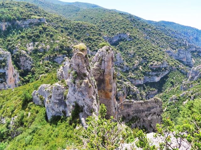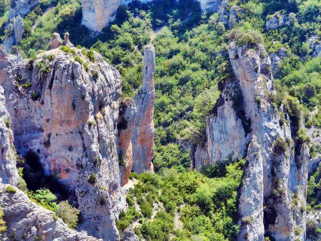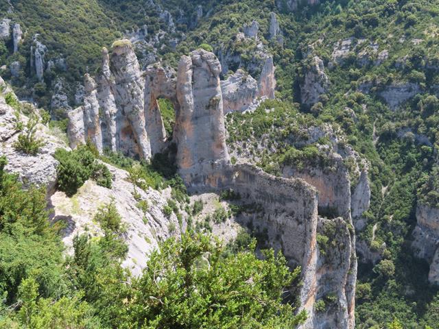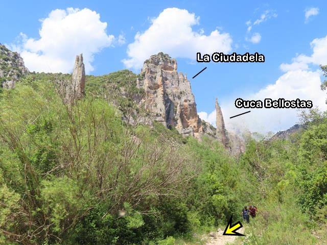 Al descender la Costera de Otín no he podido apreciar dos emblemáticas formaciones de esta parte del Mascún, que sí se aprecian mejor si realizas la ruta en sentido contrario; la Ciudadela y la Cuca Bellostas.La Cuca Bellostas es una aguja rocosa muy característica, mientras que La Ciudadela es una cornisa o cresta rocosa que se alza sobre el barranco Mascún. Me doy la vuelta en el sentido contrario al de la marcha y…ahí están, como os enseño en la foto de debajo.