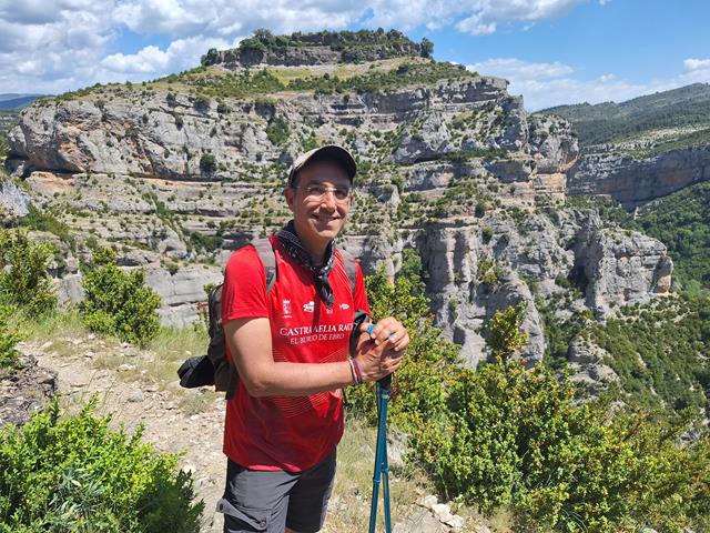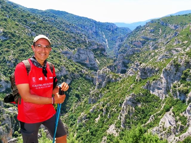 Una zona en la que el sendero accede a una pequeña pero espaciosa cornisa, me permite contemplar la profundidad del barranco del Mascún hasta donde alcanza el horizonte.Con el zoom de la cámara y la ayuda del trípode, lo acerco y me coloco en el encuadre para conseguir una bonita foto de recuerdo de este espectacular paisaje.