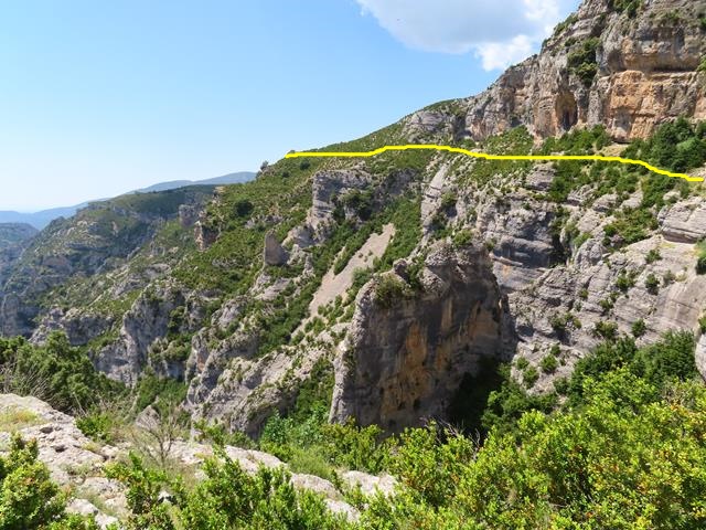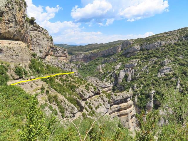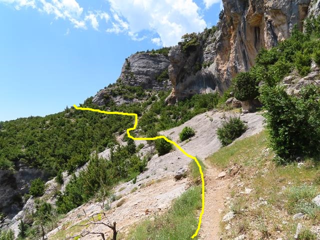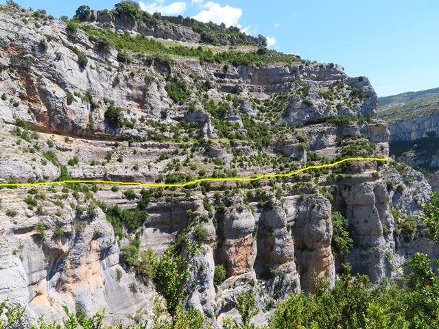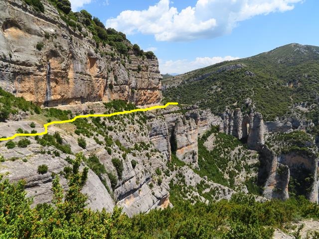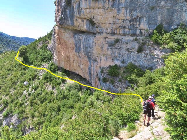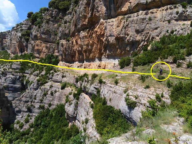 Como me he retrasado un poco haciendo la foto, puedo sacar a Javier desde aquí recorriendo el siguiente tramo de la faja del mirador del Mascún por la que vamos hoy. En la foto de debajo os lo pongo en un círculo, y también os marco el sendero por el que vamos a ir en amarillo.