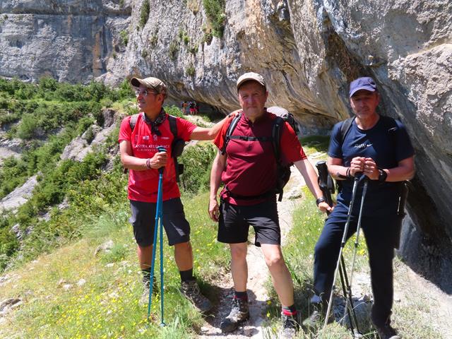 Nada más comenzar, las vistas son espectaculares. A nuestra izquierda, en el otro lado, el sendero por donde discurre la faja Raisín, y a nuestros pies ya comienzan a aparecer las curiosas formaciones rocosas que la erosión ha esculpido durante millones de años. Y esto sólo es el principio. Como hay espacio suficiente para colocar el trípode, decidimos hacernos una foto los tres.
