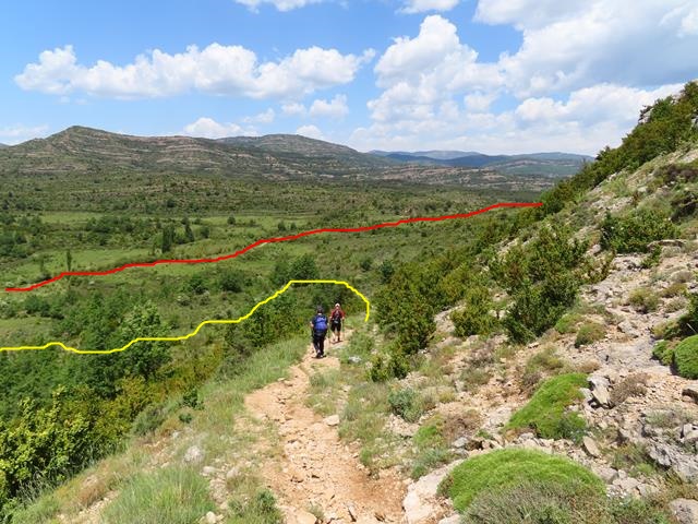 En la foto de debajo os pongo el sendero que haremos hasta Otín, en amarillo, y al fondo, en rojo, el trazado de la pista de Letosa que hemos hecho antes para ir al barranco Raisín desde Otín y que ahora no vamos a recorrer.