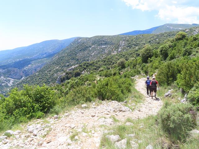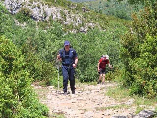 Son las 13;10 horas cuando ya el sendero va abandonando los cortados para dirigirse a una zona menos expuesta en medio de la vegetación. Parece que intuimos que la faja por la que vamos toca a su fin.