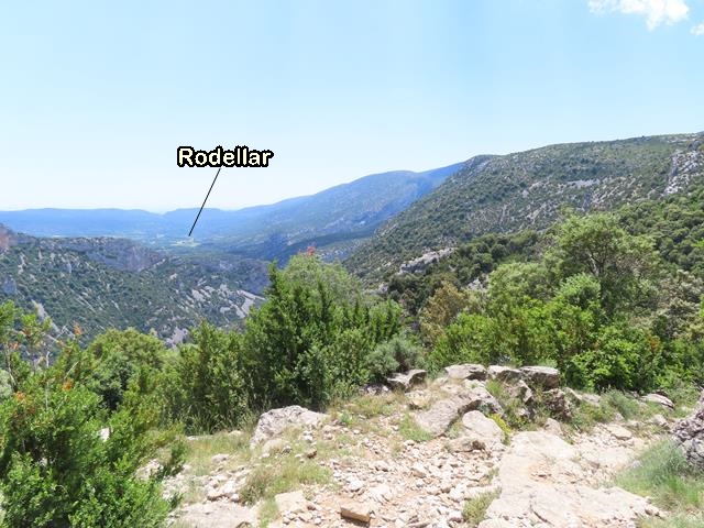 Son las 14:30 horas. Estamos descendiendo este sendero de la Costera de Otín cuando a lo lejos me parece adivinar el pueblo de Rodellar. Aún nos queda un buen trecho.