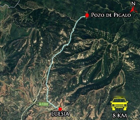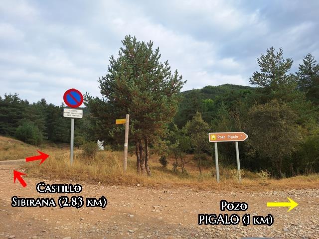 Tras un cuarto de hora en coche tras salir de Luesia, llegamos a las proximidades del Pozo de Pigalo y a una bifurcación de la pista. Hacia la izquierda un ramal se dirige hacia el castillo de Sibirana y la ermita de Santa Quiteria, de la que nos separan casi 3 km desde este punto. Si seguimos recto, tal y como nos indica una señal, en 1 km llegaremos al Pozo de Pigalo.