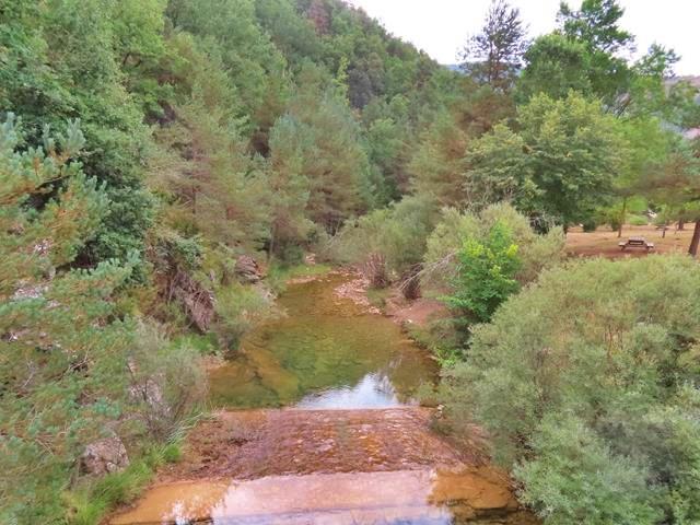 Sobre el puente, aprovecho para hacer un par de fotos, una hacia cada lado del río. No baja muy bravo en estas fechas, pero lo suficiente para mantener un mínimo caudal y llenar las pozas. El silencio es total, no hay nadie por aquí de momento y sólo los sonidos de la naturaleza nos acompañan.