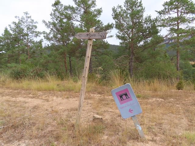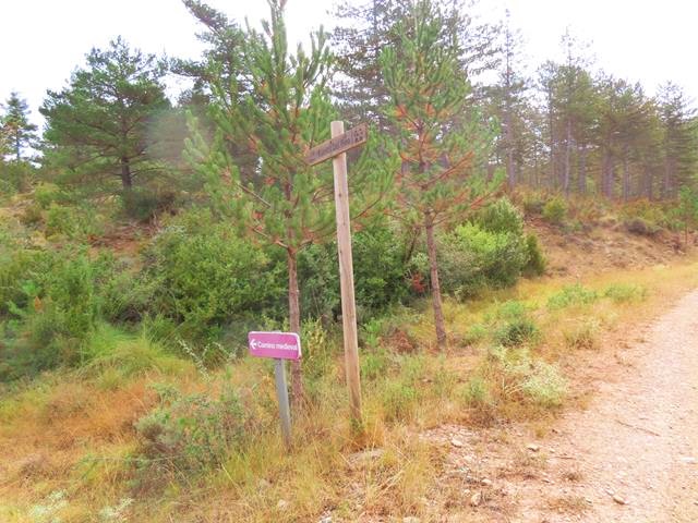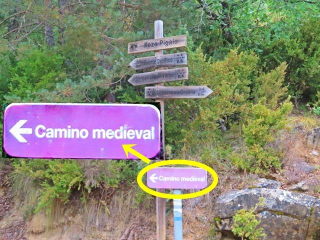 Continuamos por la amplia pista que va ascendiendo paulatinamente y junto a una curva nos encontramos con otro poste de señales y cartelería varia. Ninguna indica nuestro destino, pero hay un cartel, apartado del resto, que con fondo rosáceo – tal vez morado en origen y ahora descolorido- dice: «camino medieval».
