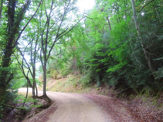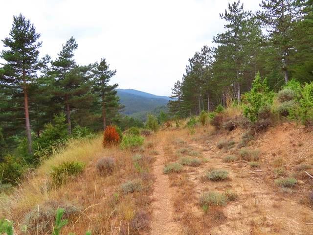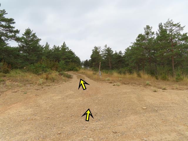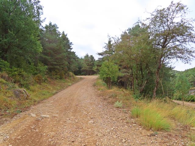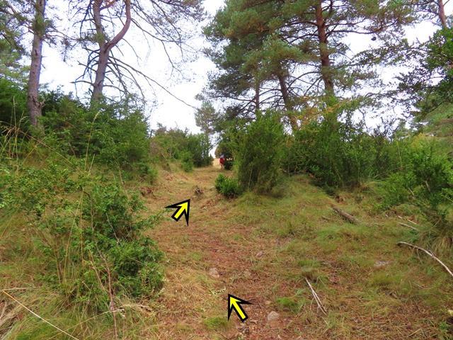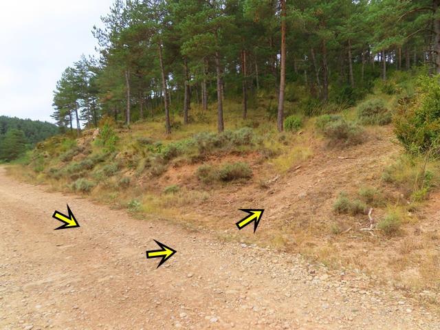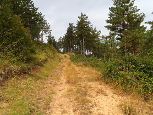 Esta variante se ve claramente que no se utiliza hace tiempo. Más parece un sendero ancho que una pista como tal. Rodeados de pinos y de zarzamoras vamos avanzando. La impresión que me da es que estamos rodeando por el norte el monte que antes vimos desde la pista en el camino de ida. No sé donde lleva, pero confío que al final nos deje en Pigalo, tal y como prometía el poste de dirección.