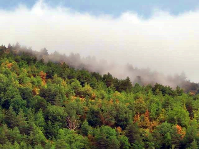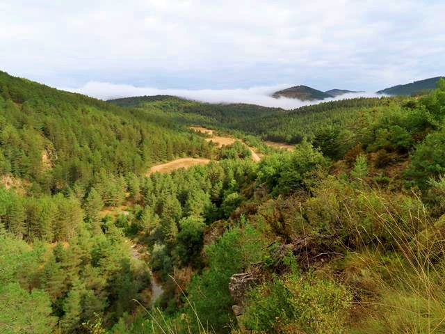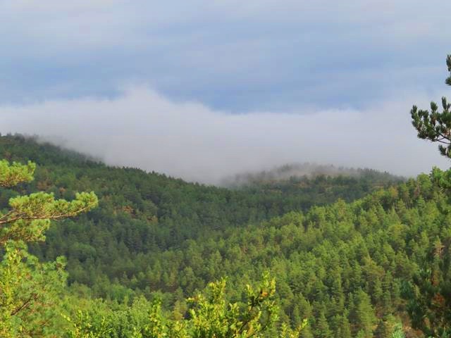 Cuando la vegetación me deja ver el horizonte, descubro que las nubes aún no han abandonado totalmente la parte alta de los montes. Una neblina, -que no es otra cosa que unas cuantas nubes de tipo estratiforme cuya base está en el suelo- cubre los árboles dándoles un velo de misterio y creando a estas horas de la mañana una atmósfera como de ensueño.