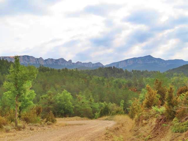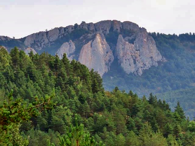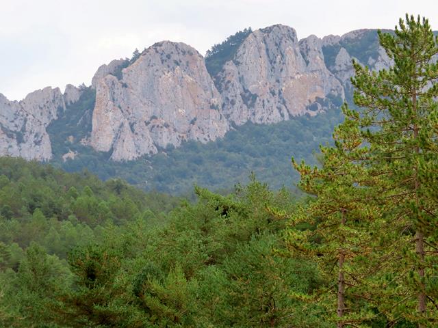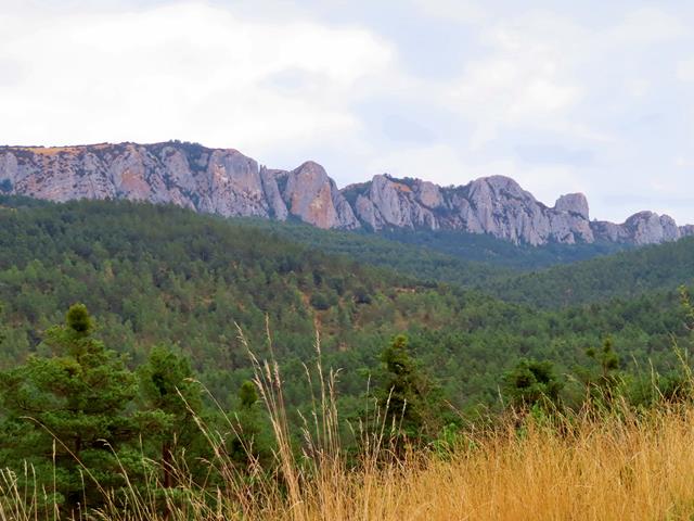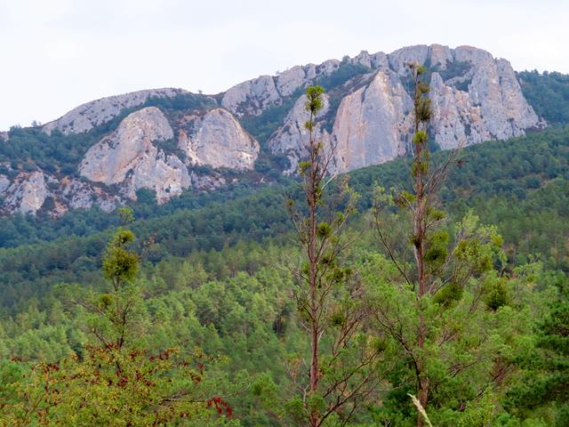 Pasado el hayedo entramos en una zona de pinar. En el horizonte, al frente, parte de la Sierra de Santo Domingo se eleva altiva ante nuestros ojos. Con el zoom alcanzo a fotografiar alguno de sus peñascos. No son los imponentes Pirineos, pero aún así, me resultan majestuosos. El pico más alto de esta sierra se encuentra en la provincia de Zaragoza, y es precisamente el pico Santo Domingo con 1.525 m de altura. Podría ser el objetivo de alguna próxima salida.