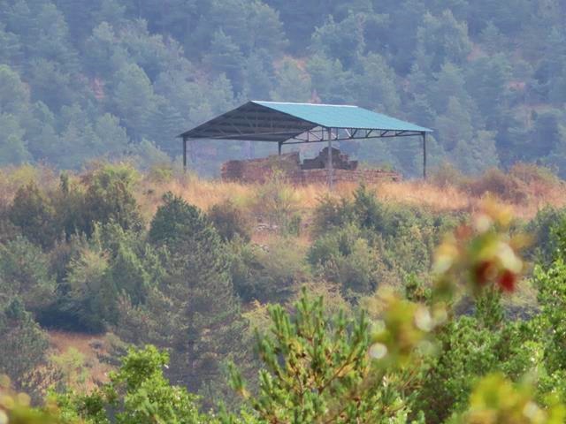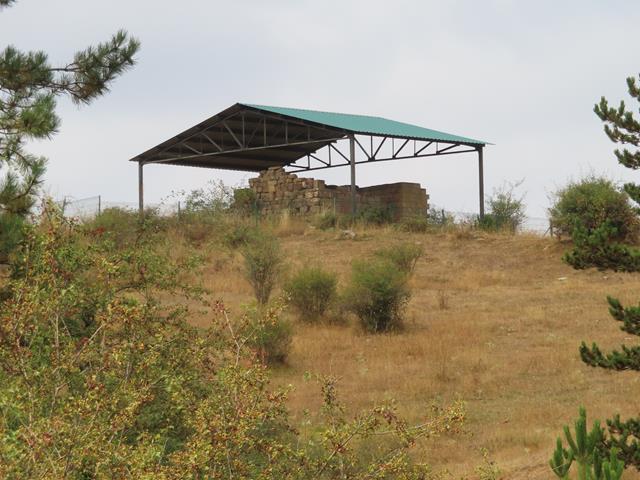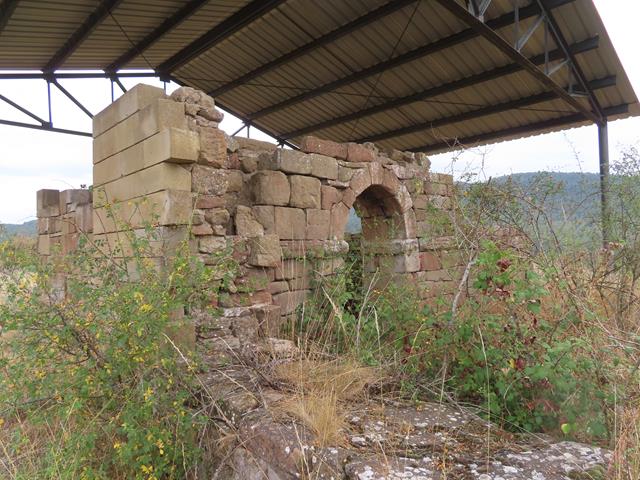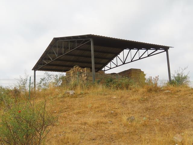 Tan sólo 5 minutos después de ver los carteles, y siguiendo el camino, vemos aparecer sobre una lometa cercana, el tejadillo que protege el conjunto arqueológico. Nos dirigimos hacia allí.