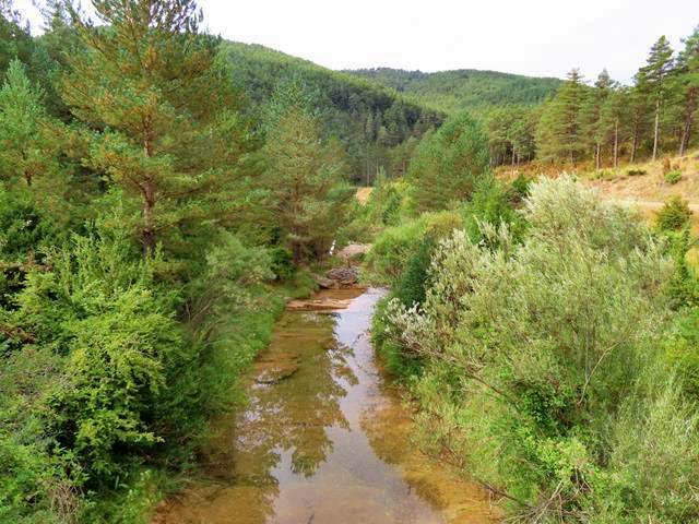 Al poco rato de dejar la indicación del sendero medieval, la pista, que ha mantenido el río Arba de Luesia a su derecha, tiene que atravesarlo de nuevo. Por un puentecillo lo cruzamos. Saco una foto de como se ve el río a cada lado.Aguas calmas pero claras,que permiten ver el fondo del cauce.