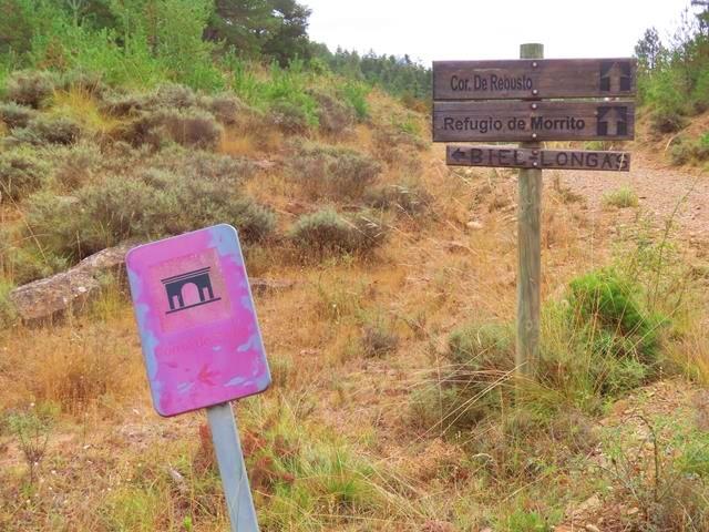 A los pocos minutos de iniciar la marcha la pista cruza por un puente el río Arba de Luesia. A mano izquierda hay abundante cartelería.Uno de ellos,en el que hay dibujado un arco monumental sobre un fondo rosáceo, nos indica la dirección a seguir para ir al Corral de Calvo, pero el tiempo lo ha deteriorado bastante haciendo que se vea bastante mal.